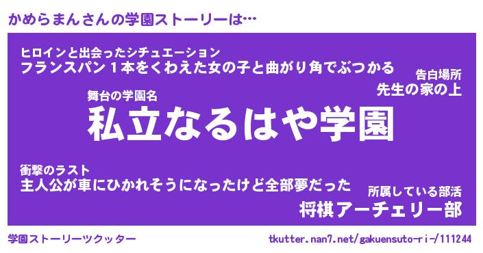 | 胡散臭い通販商品みたいなあだ名 | 『必ず成功する霊験あらたかなお札…その名も「かめらまん」』 |