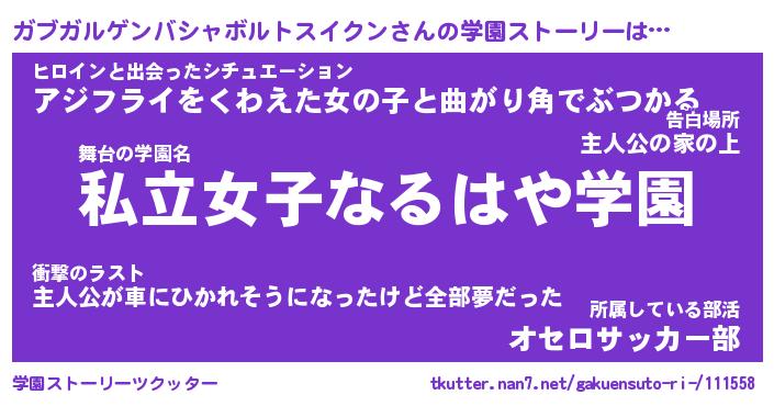 | 学校 | ガブガルゲンバシャボルトスイクン校長が勤める学校の名前『都立男子ゆるゆる高校』 |