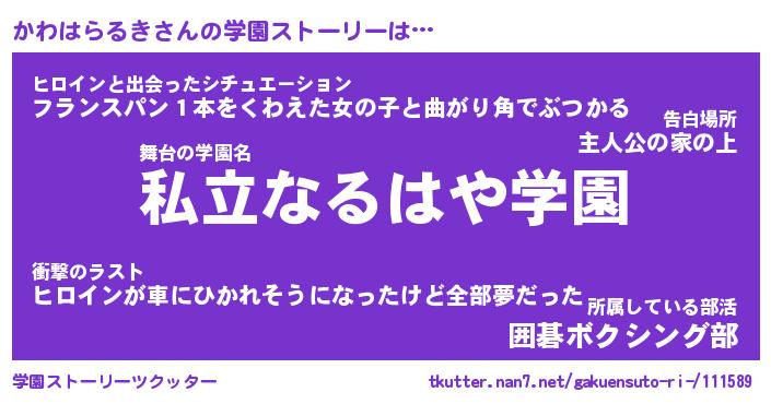 | 伝説のあだ名 | 『伝説のスナイパーかわはらるき』 |