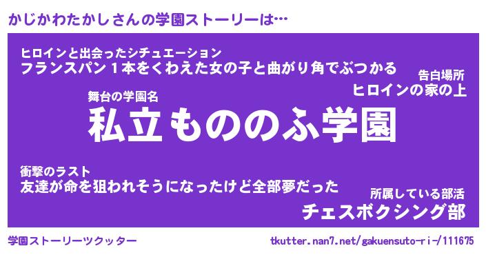 | 女子向けラノベタイトル風あだ名 | 『(仮)かじかわたかしのやんごとなき事情』 |