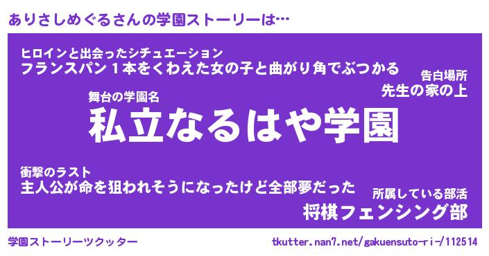 | 女子向けラノベタイトル風あだ名 | 『(仮)ありさしめぐるのやんごとなき事情』 |