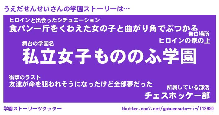| 女子向けラノベタイトル風あだ名 | 『誰かこのうえだせんせいを説明してください! ~契約から始まるウェディング~』 |