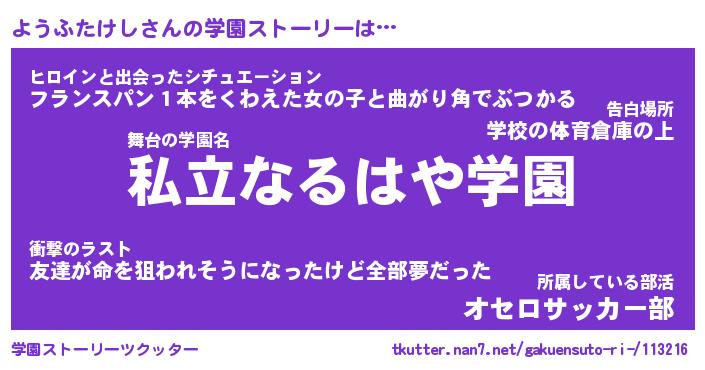 | ヒーロー風カッコイイあだ名 | 『スーパーヨウフタケシ』『銀牙騎士ヨウ』 |