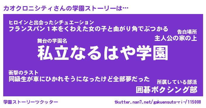 | 女子向けラノベタイトル風あだ名 | 『(仮)カオクロニシティのやんごとなき事情』 |