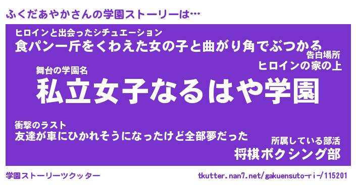 | 女子向けラノベタイトル風あだ名 | 『誰かこのふくだあやかを説明してください! ~契約から始まるウェディング~』 |