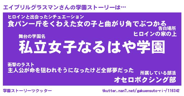 | 女子向けラノベタイトル風あだ名 | 『エイプリルグラスマン姫と円卓の騎士』 |