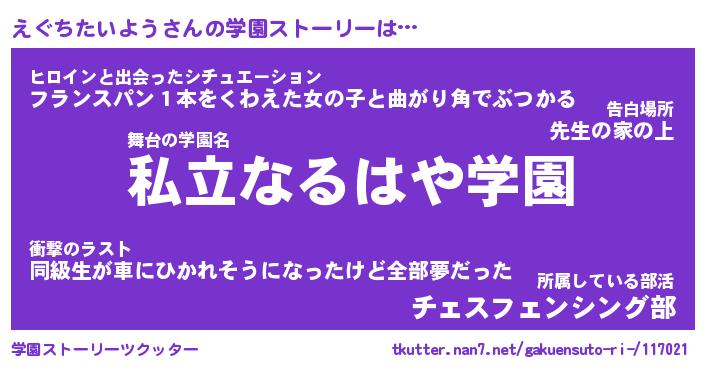 | 料理風あだ名 | 『節約★えぐちたいようと油揚げの玉子丼』 |