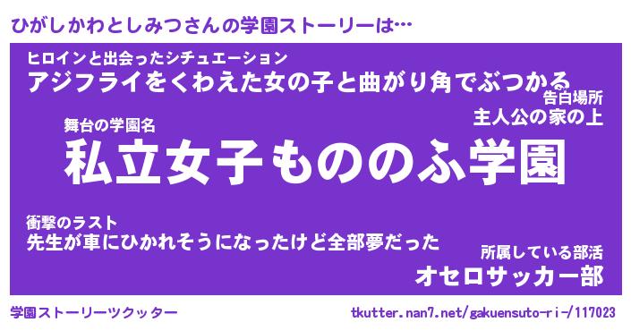 | 男性向けラノベタイトル風あだ名 | 『ヒガシカワトシミツアートオンライン』 |