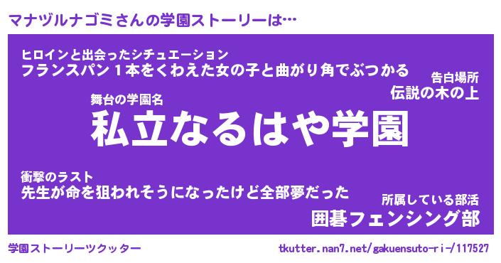 | 男性向けラノベタイトル風あだ名 | 『マナヅルナゴミの憂鬱』 |