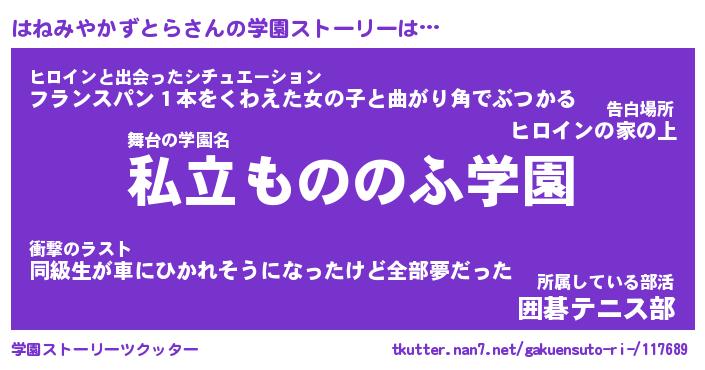 | 男性向けラノベタイトル風あだ名 | 『はねみやかずとらの憂鬱』 |