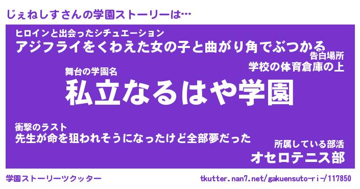 | 伝説のあだ名 | 『伝説のスナイパーじぇねしす』 |
