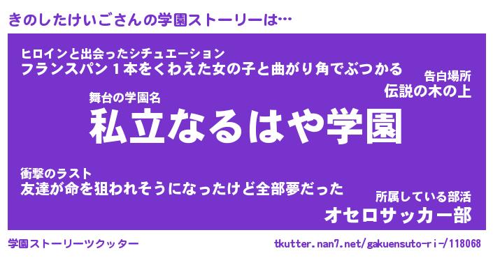 | 男性向けラノベタイトル風あだ名 | 『きのしたけいごの憂鬱』 |