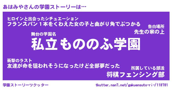 | 女子向けラノベタイトル風あだ名 | 『(仮)あはみやのやんごとなき事情』 |