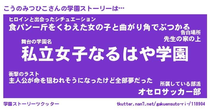 | 女子向けラノベタイトル風あだ名 | 『誰かこのこうのみつひこを説明してください! ~契約から始まるウェディング~』 |