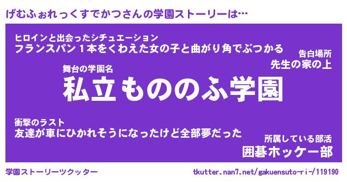 | 女子向けラノベタイトル風あだ名 | 『(仮)げむふぉれっくすでかつのやんごとなき事情』 |