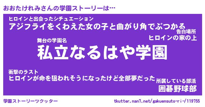 | 女子向けラノベタイトル風あだ名 | 『(仮)おおたけれみのやんごとなき事情』 |