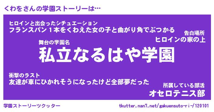 | 女子向けラノベタイトル風あだ名 | 『(仮)くわをのやんごとなき事情』 |