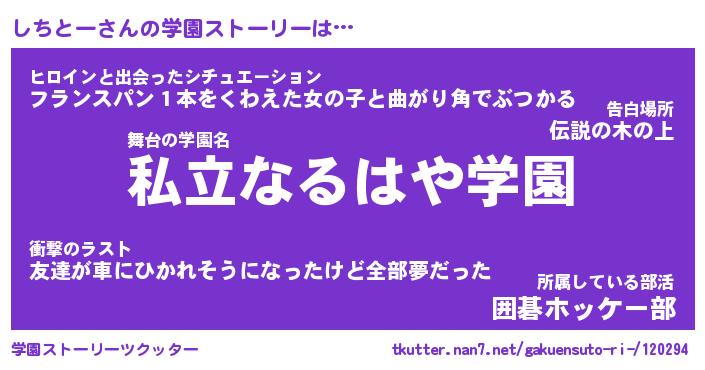| 男性向けラノベタイトル風あだ名 | 『しちとーの憂鬱』 |
