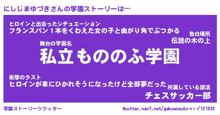 | 男性向けラノベタイトル風あだ名 | 『にしじまゆづきの憂鬱』 |