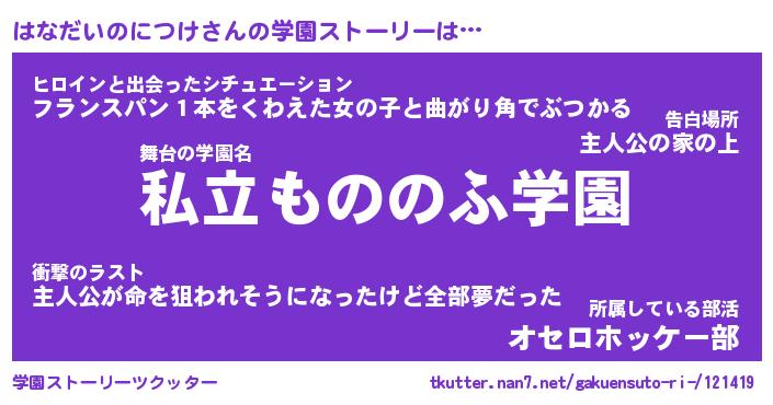 | 男性向けラノベタイトル風あだ名 | 『はなだいのにつけの憂鬱』 |