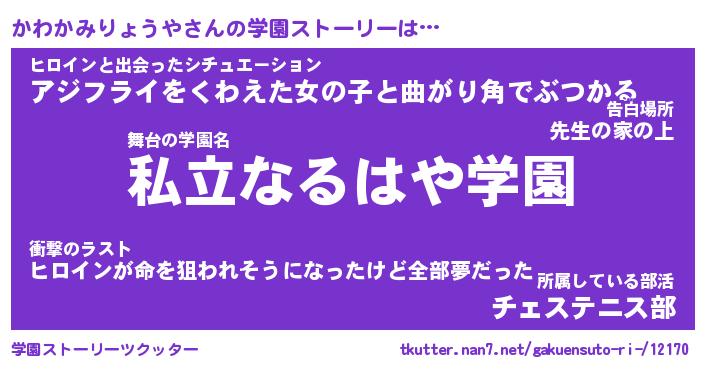 | 女子向けラノベタイトル風あだ名 | 『かわかみりょうや姫と円卓の騎士』 |