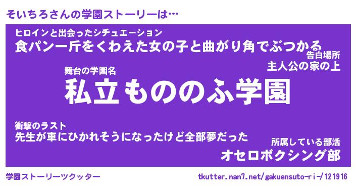 | 女子向けラノベタイトル風あだ名 | 『(仮)そいちろのやんごとなき事情』 |