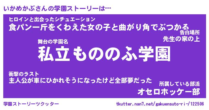 | 男性向けラノベタイトル風あだ名 | 『いかめかぶの憂鬱』 |