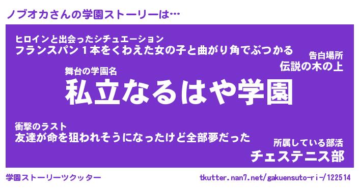 | 男性向けラノベタイトル風あだ名 | 『ノブオカの憂鬱』 |