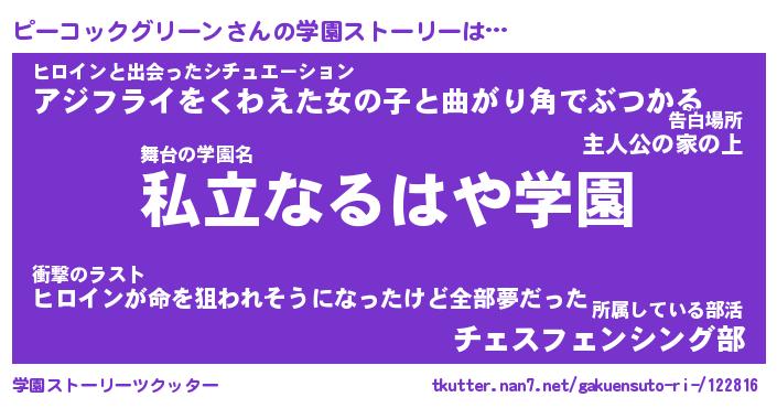 | 男性向けラノベタイトル風あだ名 | 『ピーコックグリーンの憂鬱』 |