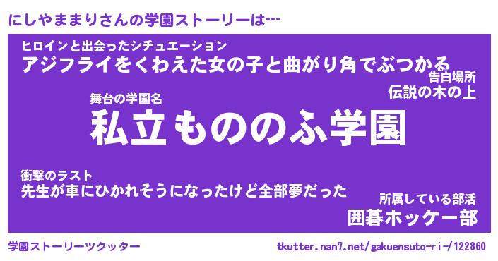 | 男性向けラノベタイトル風あだ名 | 『にしやままりの憂鬱』 |