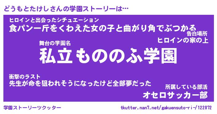 | 女子向けラノベタイトル風あだ名 | 『(仮)どうもとたけしのやんごとなき事情』 |