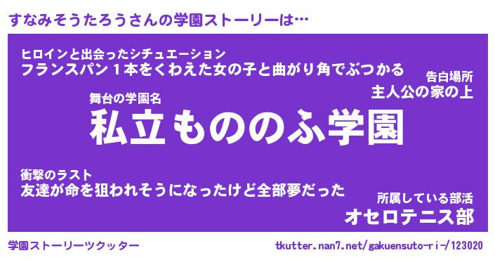 | 男性向けラノベタイトル風あだ名 | 『すなみそうたろうの憂鬱』 |