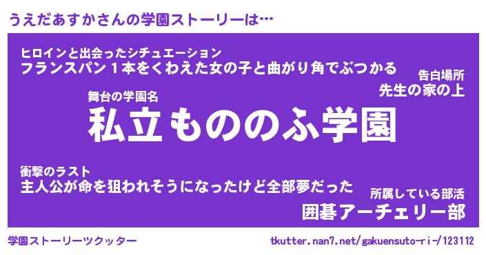 | 女子向けラノベタイトル風あだ名 | 『(仮)うえだあすかのやんごとなき事情』 |