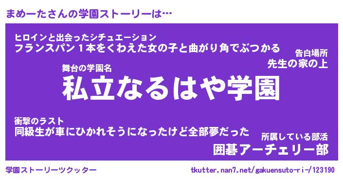 | 伝説のあだ名 | 『伝説のスナイパーまめーた』 |
