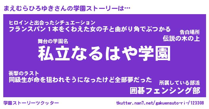 | 女子向けラノベタイトル風あだ名 | 『(仮)まえむらひろゆきのやんごとなき事情』 |