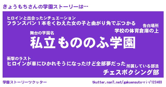 | 男性向けラノベタイトル風あだ名 | 『きょうもちの憂鬱』 |