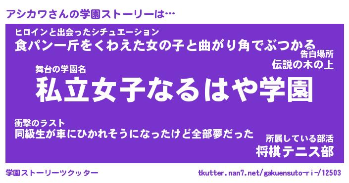 | 男性向けラノベタイトル風あだ名 | 『アシカワアートオンライン』 |