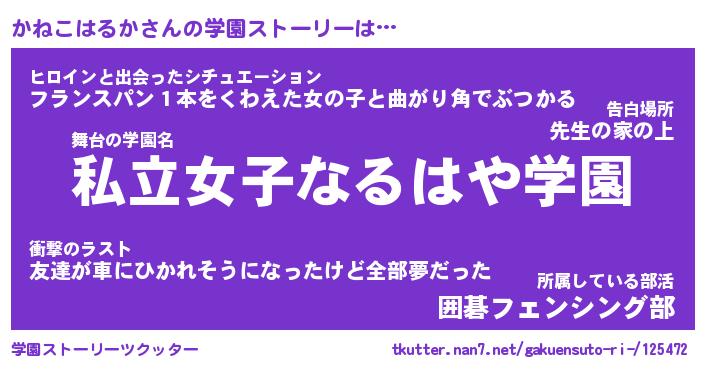 | 女子向けラノベタイトル風あだ名 | 『かねこはるか姫と円卓の騎士』 |
