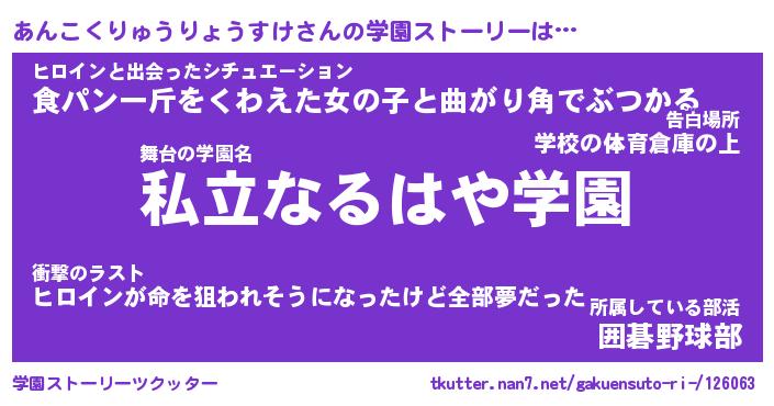 | 男性向けラノベタイトル風あだ名 | 『あんこくりゅうりょうすけの憂鬱』 |