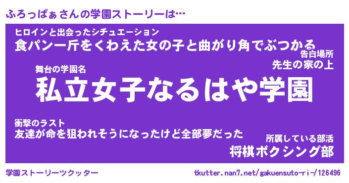 | 女子向けラノベタイトル風あだ名 | 『ふろっぱぁ姫と円卓の騎士』 |