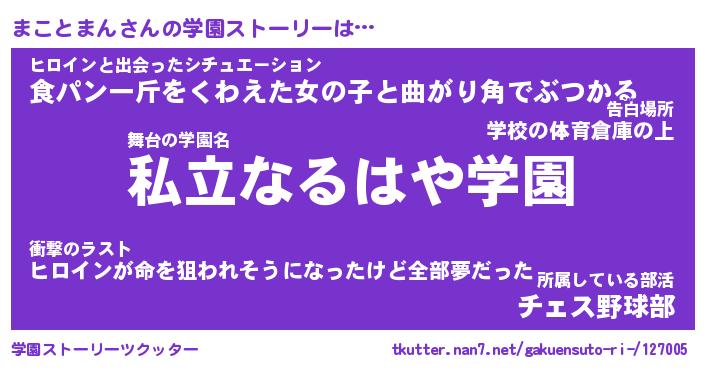 | 男性向けラノベタイトル風あだ名 | 『まことまんの憂鬱』 |