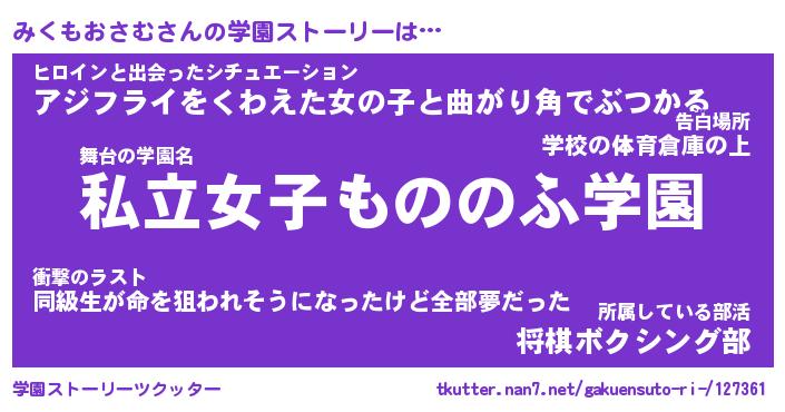| ヒーロー風カッコイイあだ名 | 『スーパーミクモオサム』『魔戒騎士ミク』 |