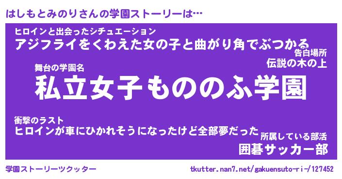 | 女子向けラノベタイトル風あだ名 | 『誰かこのはしもとみのりを説明してください! ~契約から始まるウェディング~』 |
