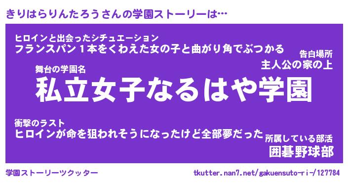 | 女子向けラノベタイトル風あだ名 | 『誰かこのきりはらりんたろうを説明してください! ~契約から始まるウェディング~』 |