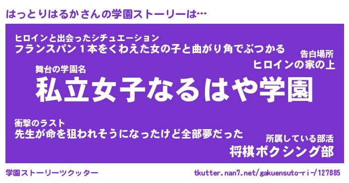 | 女子向けラノベタイトル風あだ名 | 『誰かこのはっとりはるかを説明してください! ~契約から始まるウェディング~』 |
