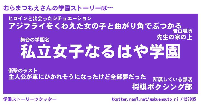 | 肩書あだ名 | 『むらまつもえ御曹司』 |