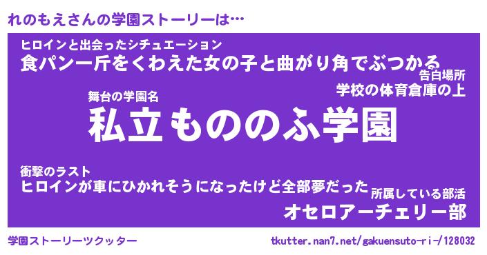 | 男性向けラノベタイトル風あだ名 | 『れのもえの憂鬱』 |