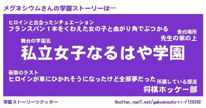 | 男性向けラノベタイトル風あだ名 | 『メグネシウムアートオンライン』 |