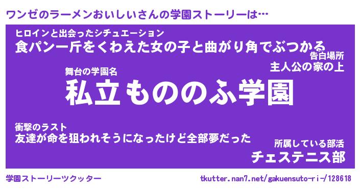 | 学校 | ワンゼのラーメンおいしい校長が勤める学校の名前『公立にょきにょき中学校』 |