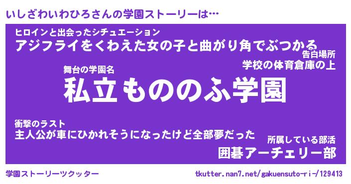 | 男性向けラノベタイトル風あだ名 | 『いしざわいわひろの憂鬱』 |